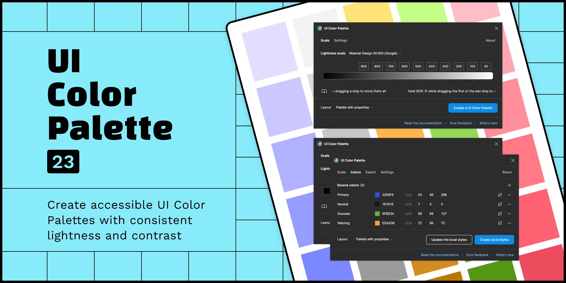 UI Color Palette creates accessible Color Palettes from your brand's colors, ensuring consistent lightness and contrast. The plugin uses the LCH color model to generate color variants based on the chosen lightness scale. This model is relevant for ensuring that colors comply with the WCAG standards.